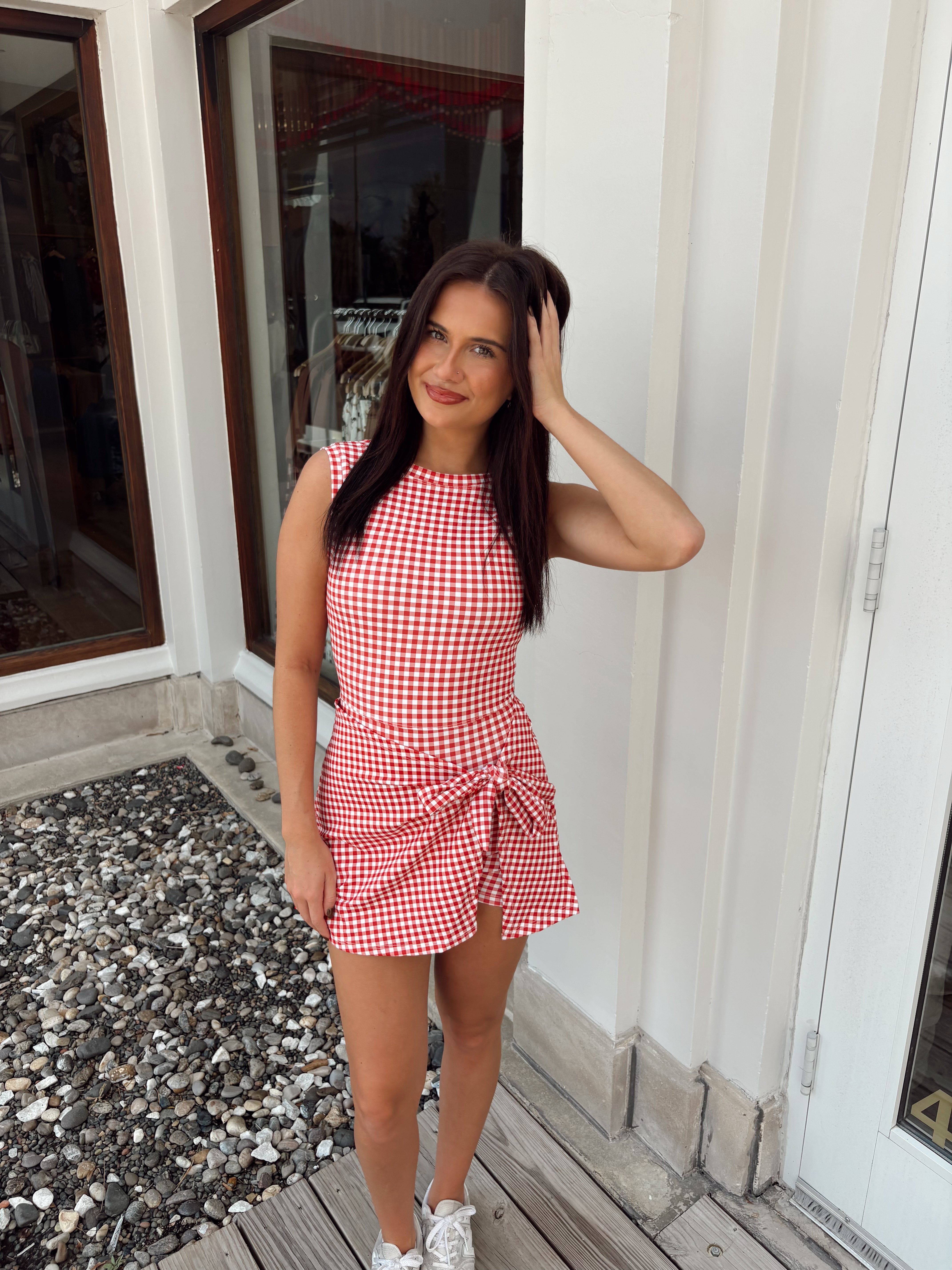 Gingham Wrap Tie Dress - Red Product form Model is 5’2 size 0-2 wearing a size small $42.00 Size Size chart S M L Quantity Add to cart Free pickup in our shop(s)