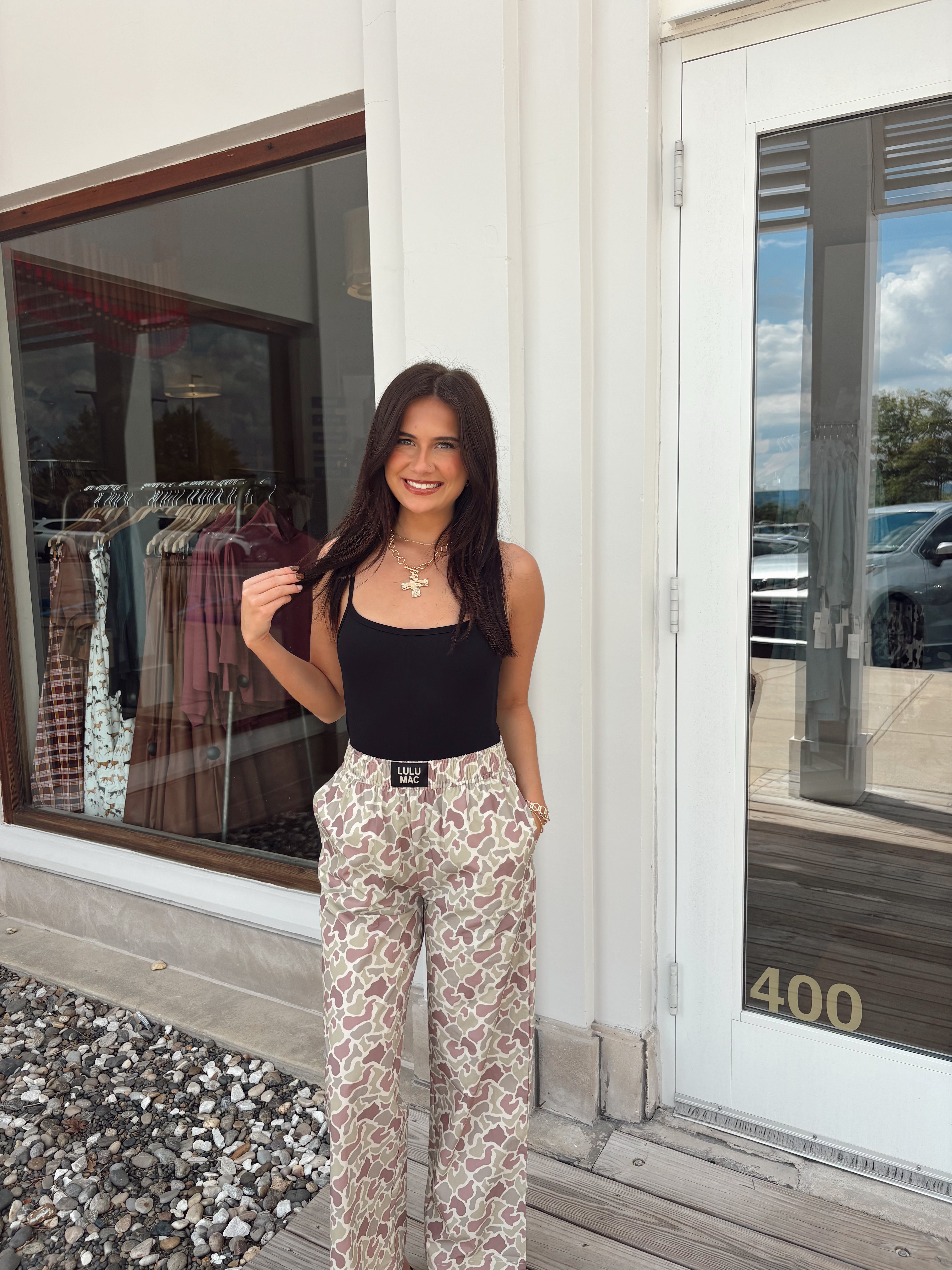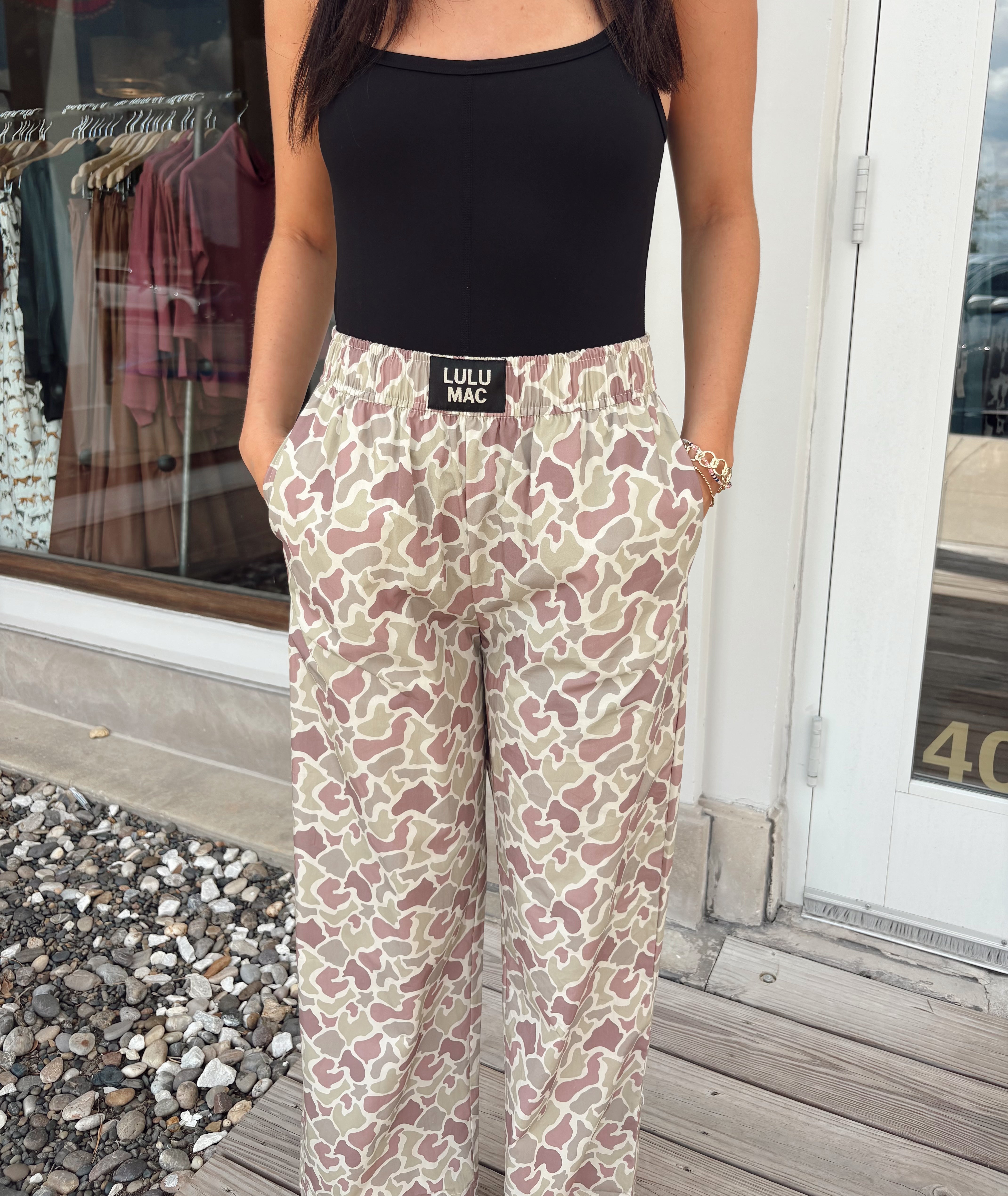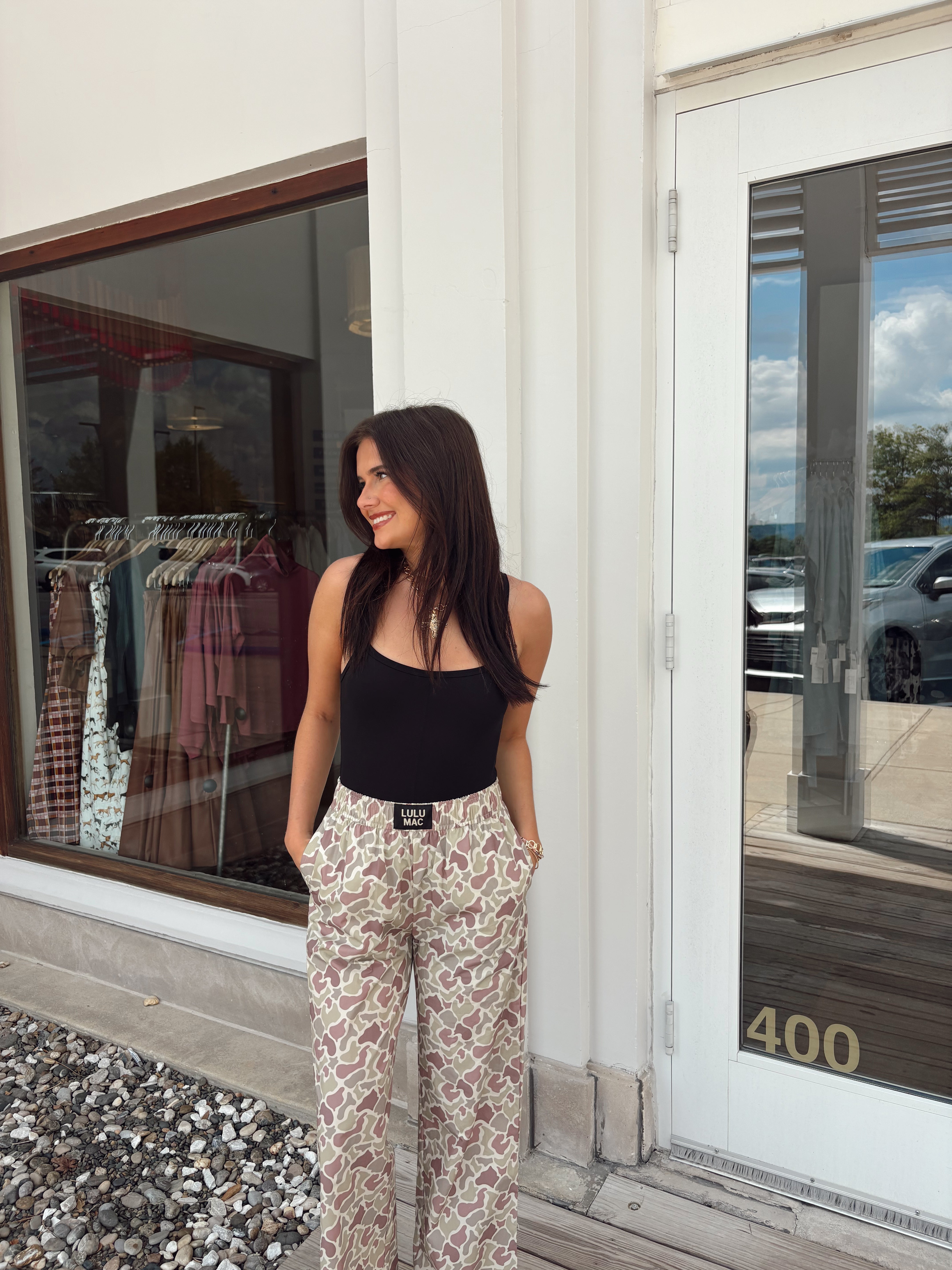 Lulu Mac Pants - Camo Product form Model is 5’2 size 0-2 wearing a size small $29.00 Size Size chart S L XL Quantity Add to cart Free pickup in our shop(s)