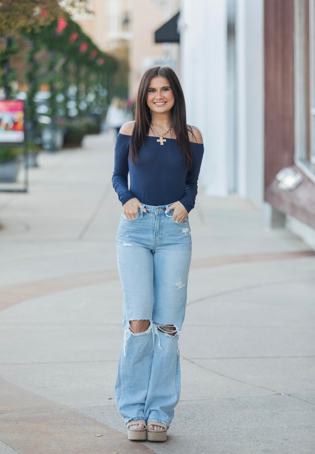 Off the Shoulder Long Sleeve Bodysuit - Blue Product form Model is 5’2 size 0-2 wearing a size small $15.00 Size Size chart small medium large Quantity Add to cart Free pickup in our shop(s)