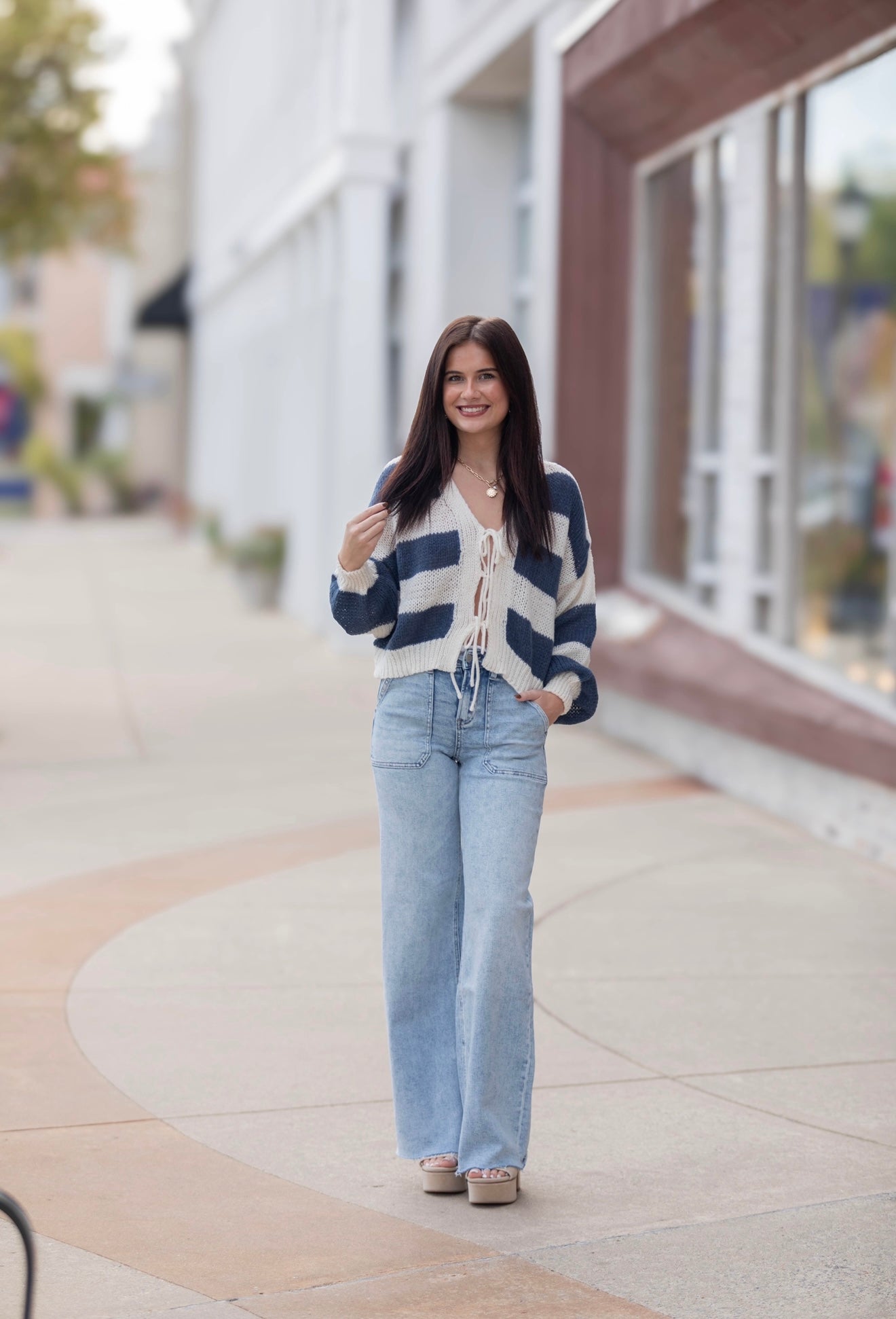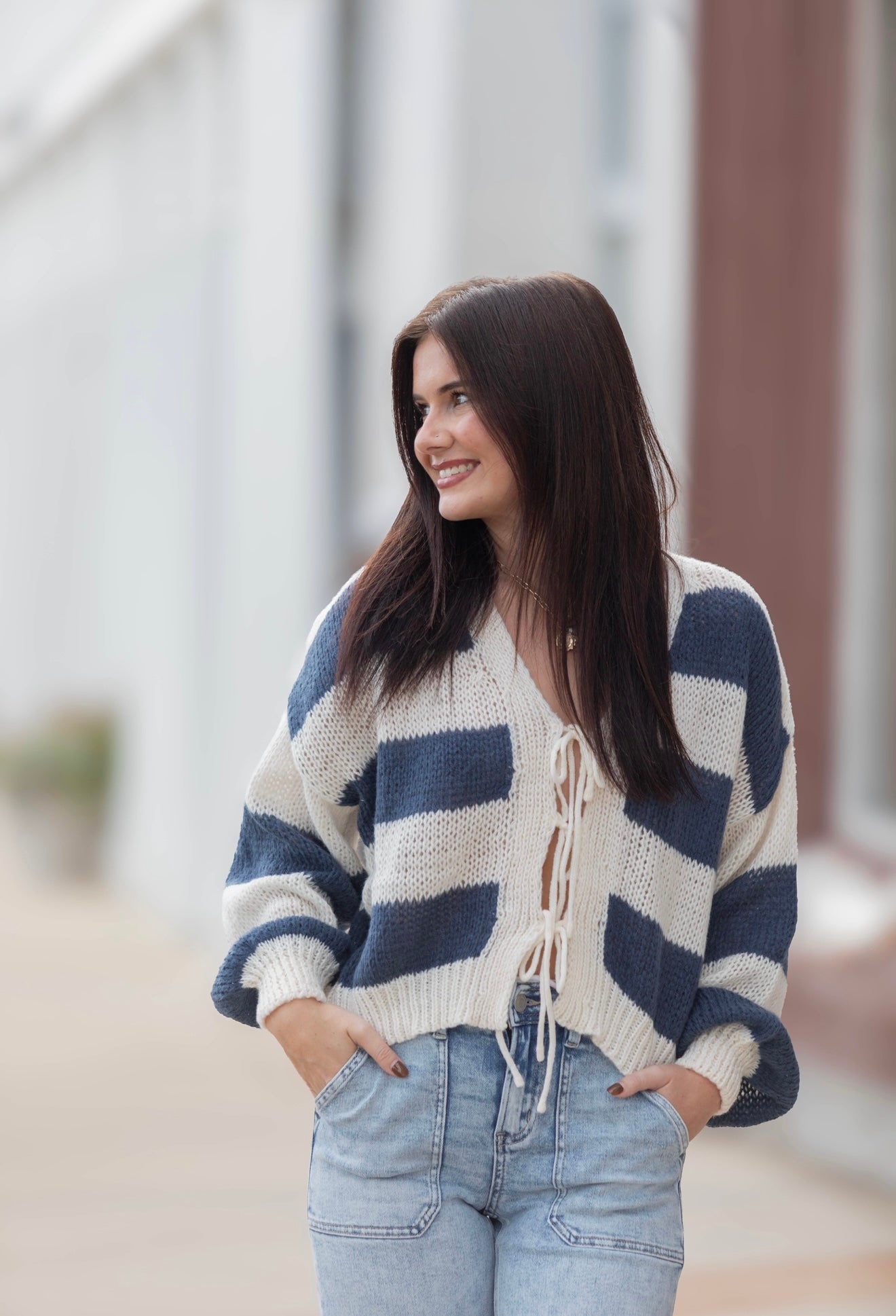 Salt & Sky Cardigan - Navy/Cream Product form Model is 5’2 size 0-2 wearing a size small $50.00 Size Size chart Small Medium Large Quantity Add to cart Free pickup in our shop(s)